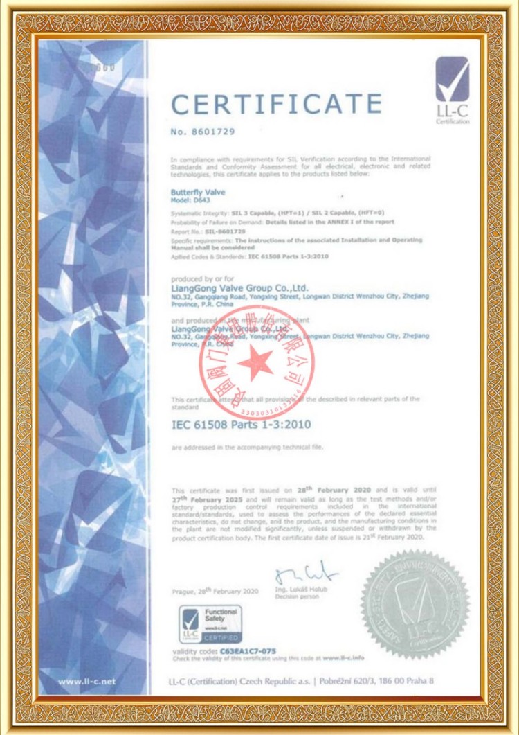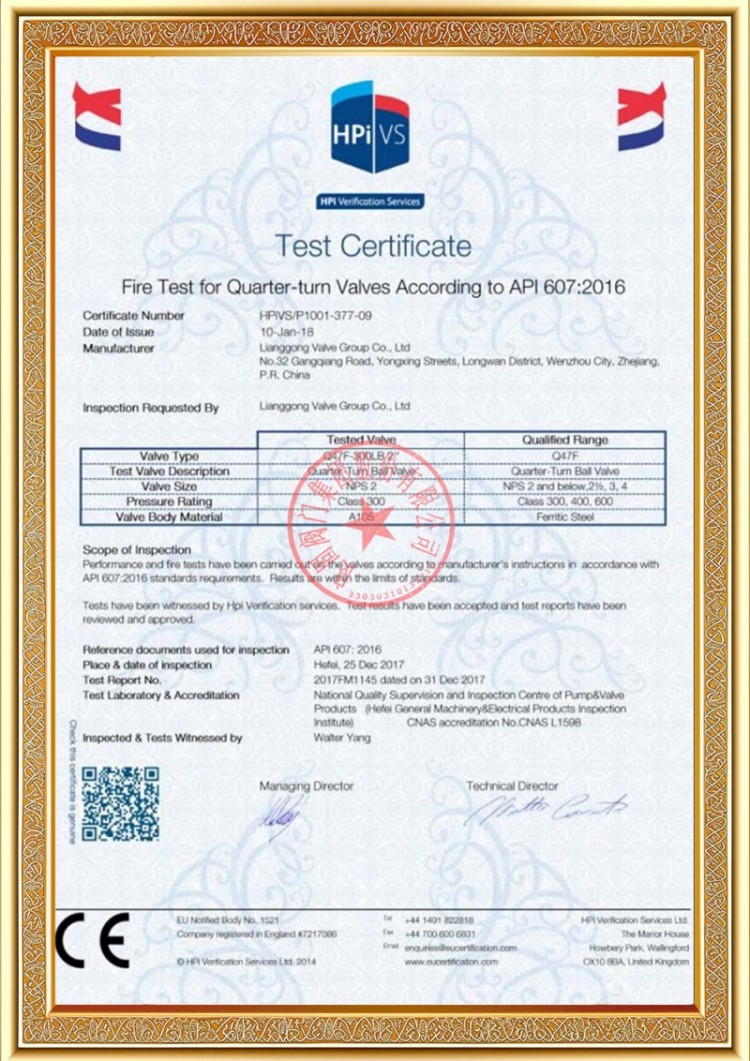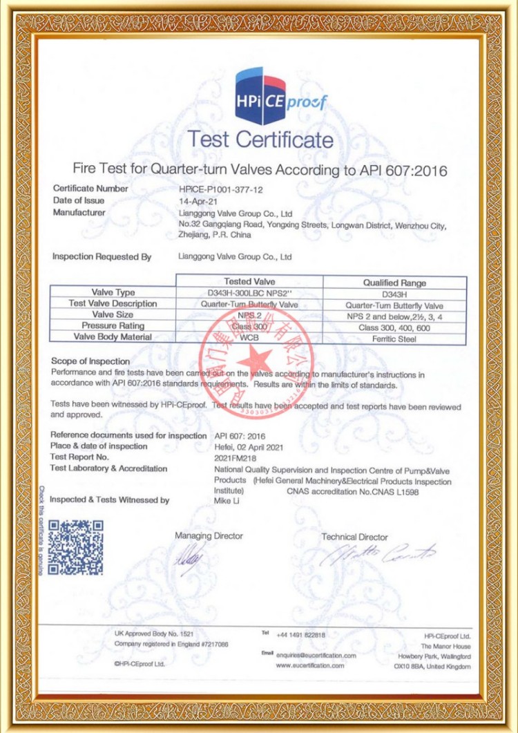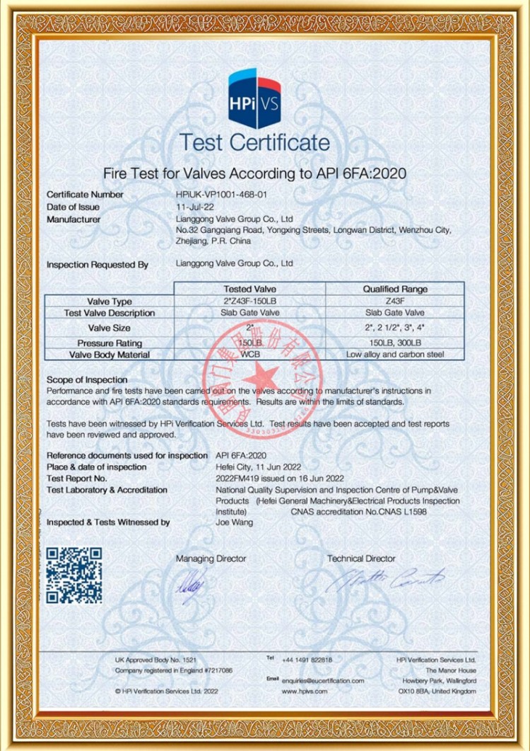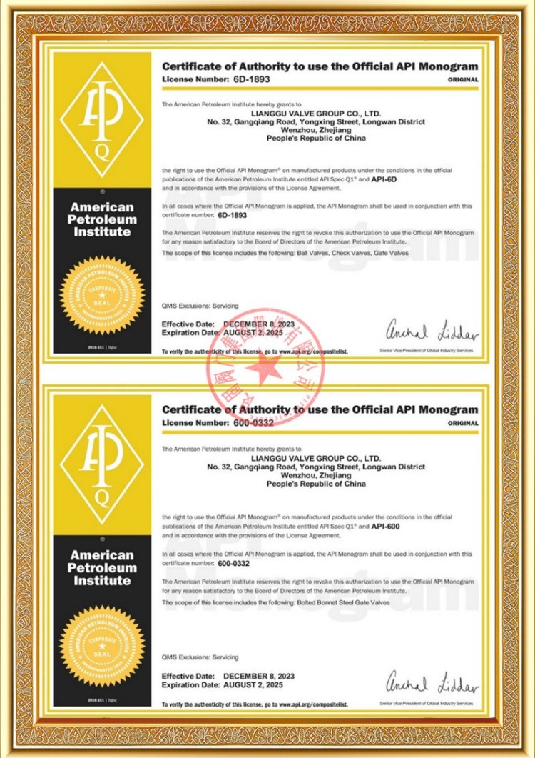 Syarikat kami mempunyai pelbagai lesen pengeluaran injap saluran paip tekanan, dan produk kami telah lulus TS A1, ISO 9001, ISO 14001, ISO 45001, API 6D, API 600, APL 609, CE/PED, API 607, API 6FA, sistem ISO 15848-1 dan EAC serta pensijilan produk. Kami juga mempunyai sijil paten ciptaan untuk pelbagai injap seperti injap bebola, injap rama-rama, injap keselamatan dan injap henti.